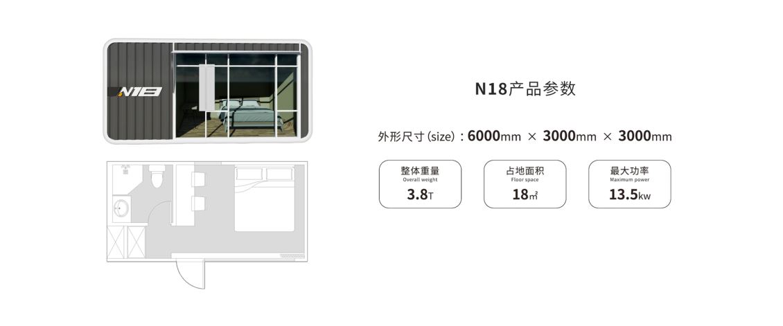 太空舱 N18(特别定制版) 以 “方正空间的采光最大化” 为设计灵感,摒弃复杂造型,用简洁利落的方正轮廓回归居住本质,同时以超大落地窗为核心设计亮点,让 18㎡的紧凑空间与自然光线深度融合,打造 “小而亮、简而舒” 的旅居体验,适配对空间利用率与采光有高要求的场景。