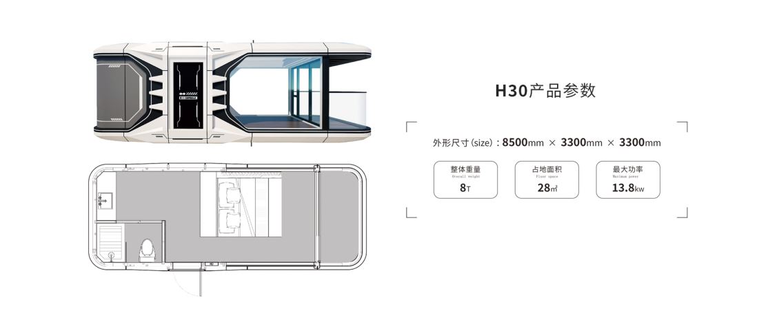 太空舱 H30 以 “未来科技美学与双人社交空间” 为设计灵感,将流线型未来感外观与温馨交互内核结合,用金属质感的凌厉线条勾勒科技轮廓,以柔和的内部光影营造亲密氛围,旨在打破传统住宿形态,为双人旅居场景注入前卫且温暖的体验。